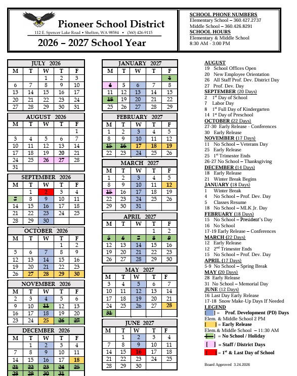 Pioneer Families We’re pleased to share that the 2026–2027 school calendar was officially approved by the Pioneer Board of Directors at their March 24, 2026 school board meeting. For your convenien...